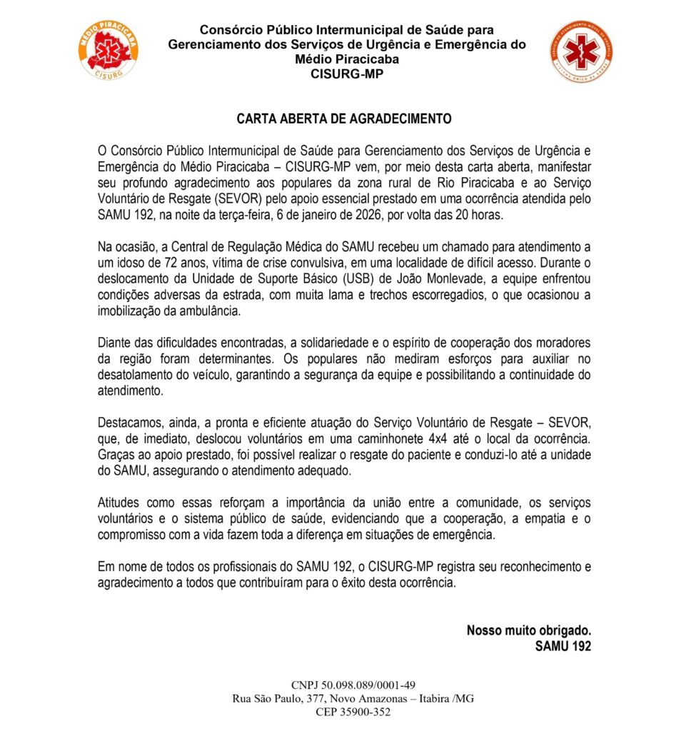 O CISURG-MP divulgou uma carta aberta agradecendo aos moradores da zona rural de Rio Piracicaba e ao Serviço Voluntário de Resgate (SEVOR) pelo apoio num momento dramático. O episódio evidencia a importância da atuação conjunta entre os serviços de emergência, equipes voluntárias e a comunidade local, especialmente em regiões de difícil acesso, onde a cooperação se torna decisiva para a preservação de vidas.