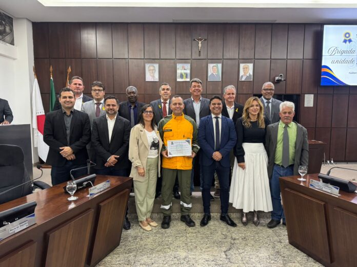 A homenagem foi entregue pelo presidente da Câmara, Fernando Linhares, ao presidente da Brigada, Saulo Amaral do Nascimento, que representou a equipe durante o ato oficial.