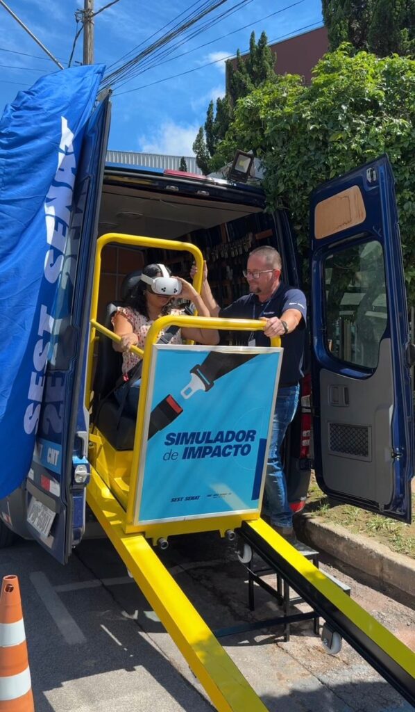 O equipamento demonstra, na prática, os efeitos de um acidente envolvendo motorista sob efeito de álcool, proporcionando uma experiência educativa e reforçando os riscos da imprudência no trânsito.