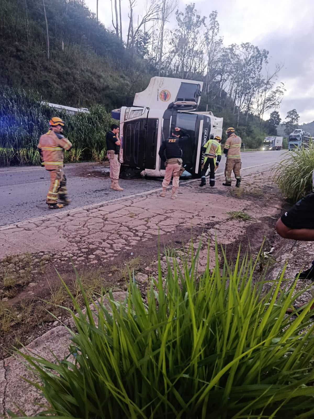 De acordo com o 11º Batalhão do Corpo de Bombeiros, a ocorrência foi registrada por volta das 5h20, após acionamento feito pela Polícia Rodoviária Federal. O condutor de uma carreta carregada com pneus seguia no sentido Belo Horizonte quando perdeu o controle do veículo, que acabou tombando fora da pista.