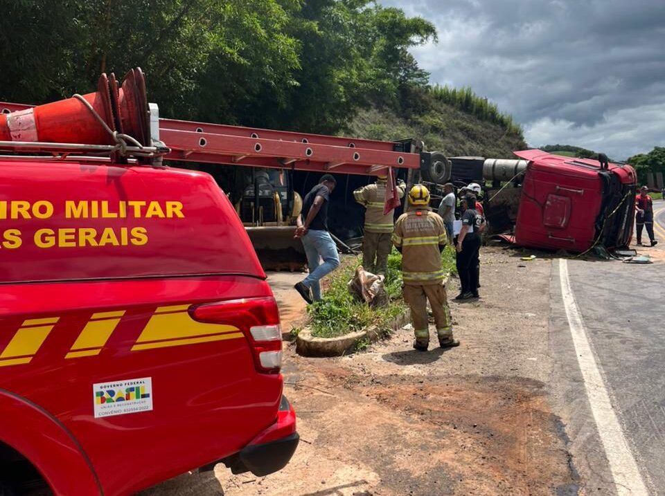 Os Bombeiros Voluntários de São Domingos do Prata foram acionados pela Polícia Militar por volta das 10h45 para atender a uma ocorrência de tombamento de carreta com colisão contra um automóvel, nas proximidades do quilômetro 186, no trecho de acesso ao município. De acordo com as informações apuradas no local, o condutor da carreta perdeu o controle da direção, o veículo tombou e acabou atingindo um Volkswagen Golf, de cor preta, que trafegava pela alça do trevo.