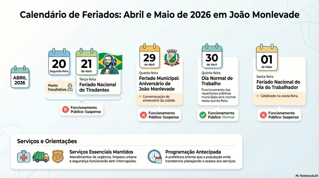 A Prefeitura de João Monlevade divulgou o calendário de feriados e pontos facultativos previstos para o fim de abril e início de maio de 2026, com o objetivo de orientar a população sobre o funcionamento das repartições públicas municipais.