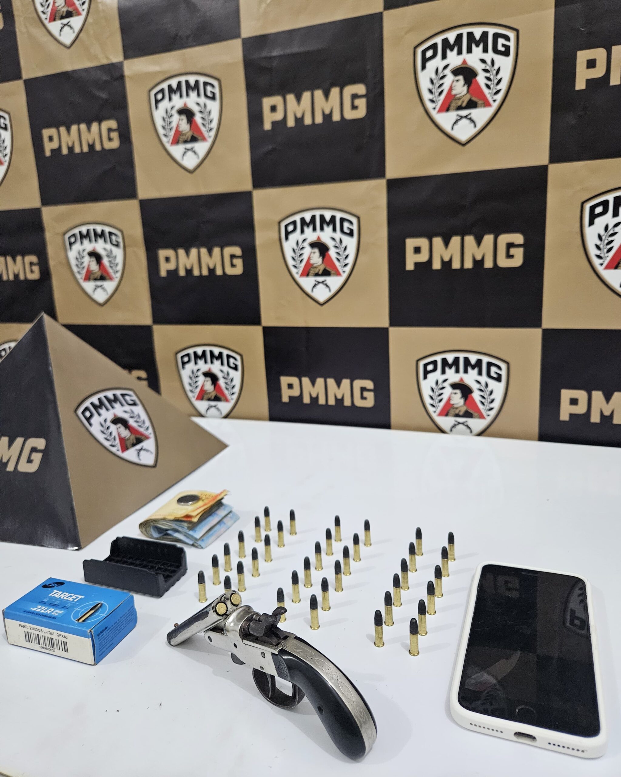 Durante a abordagem e busca pessoal, os policiais encontraram com o homem uma garrucha calibre .22, municiada com duas munições. Em continuidade às buscas, foi localizada uma caixa contendo mais munições do mesmo calibre, totalizando 38 munições apreendidas.