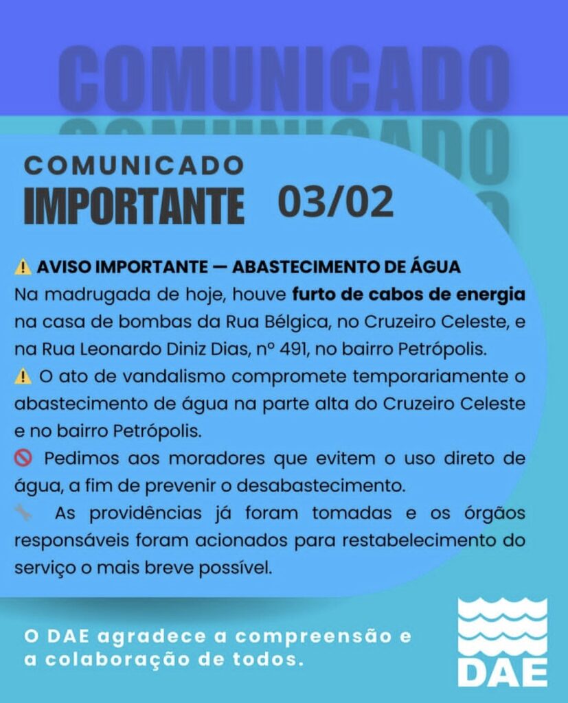 .De acordo com o Departamento de Água e Esgoto (DAE), o ato de vandalismo afetou o fornecimento principalmente na parte alta do Cruzeiro Celeste e no bairro Petrópolis. Diante da situação, a autarquia orienta os moradores dessas regiões a evitarem o uso direto da água, como forma de prevenir o desabastecimento total.