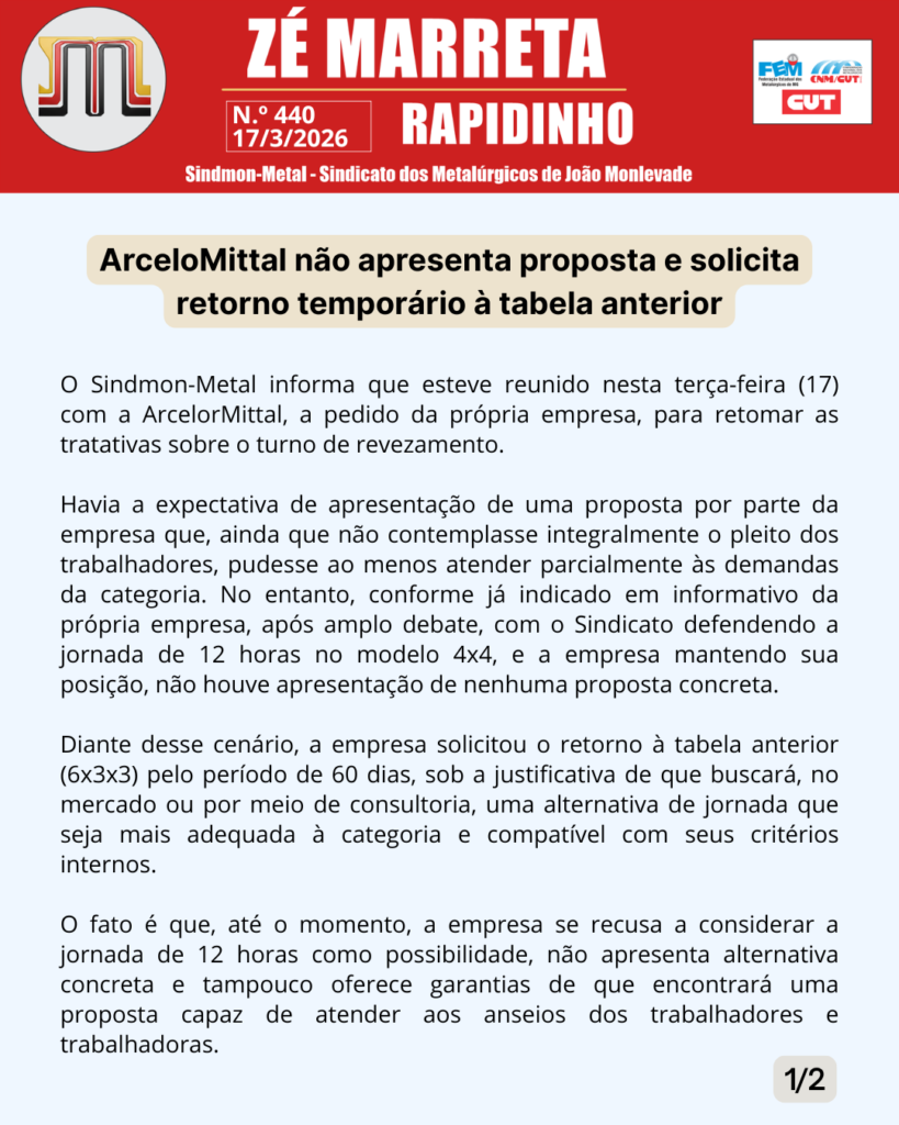O sindicato, por sua vez, critica a jornada atual e aponta possíveis impactos à saúde física e mental dos operários. A entidade defende a adoção da escala 4×4, com jornadas de 12 horas seguidas por quatro dias de folga. O formato já é aplicado em outras unidades da companhia, como Pecém (CE), Vega do Sul (SC) e Tubarão (ES). A proposta do Sindmon-Metal prevê um período de teste de seis meses para avaliação do modelo.