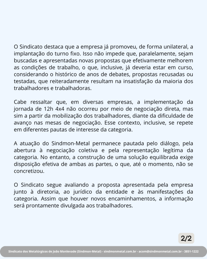 Atualmente, cerca de 670 trabalhadores seguem em turno fixo, sem alternância de horários, distribuídos entre os períodos de 7h às 15h, 15h às 23h e 23h às 7h. A empresa sustenta que a medida é legal e necessária diante da inexistência de acordo coletivo vigente, destacando que o modelo está amparado pela legislação trabalhista.