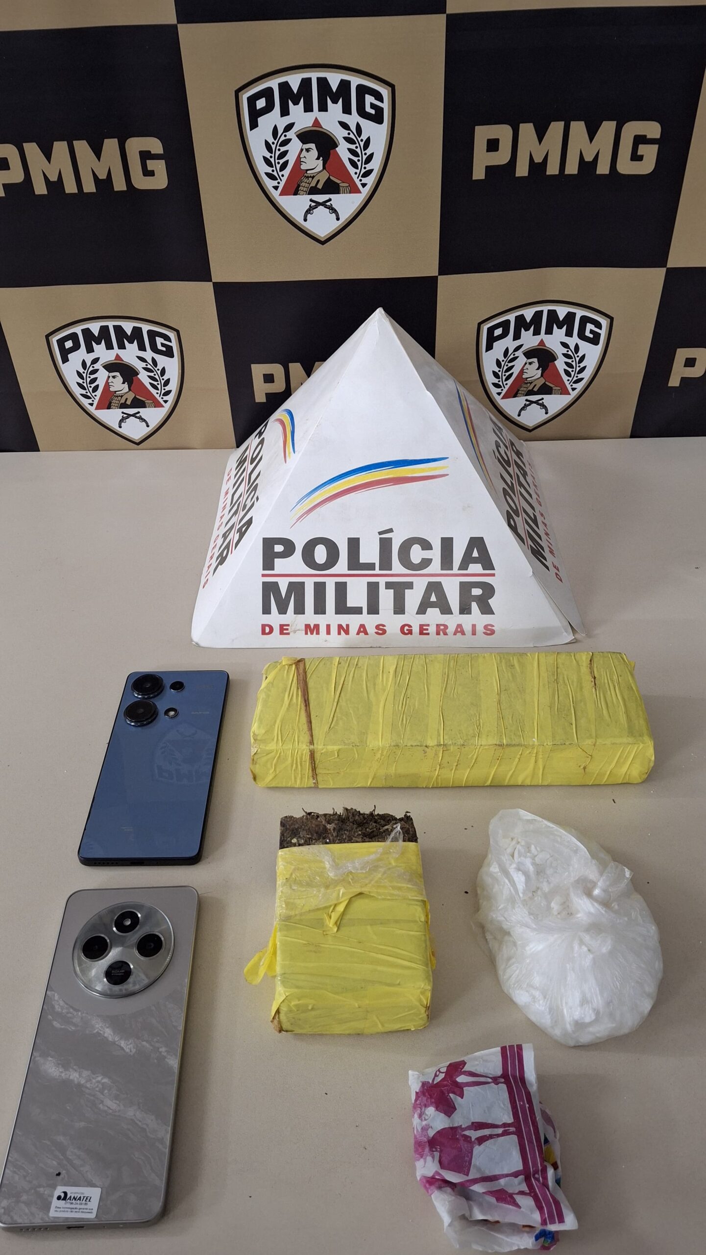 Ao todo, foram apreendidas duas barras e uma bucha de maconha, uma porção de cocaína, dois telefones celulares e a motocicleta, que foi removida para o pátio credenciado.