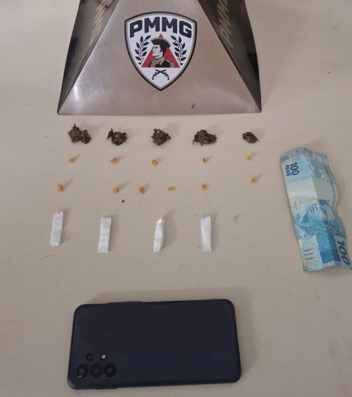 Após diligências, o automóvel foi localizado e abordado. Durante a revista, os policiais encontraram materiais ilícitos, incluindo 11 pedras de crack, quatro papelotes de cocaína, cinco porções de maconha, além de R$ 100 em dinheiro e um aparelho telefônico.