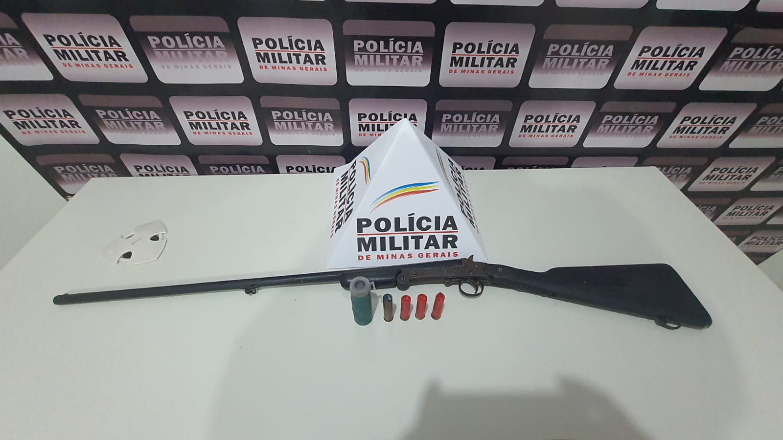 Durante conversa com os policiais, o autor informou que estava morando temporariamente em uma fazenda na região e que no local haveria uma arma de fogo pertencente a um familiar já falecido. A equipe se deslocou até a propriedade rural, onde localizou e apreendeu uma espingarda calibre .32, além de munições e pólvora.
