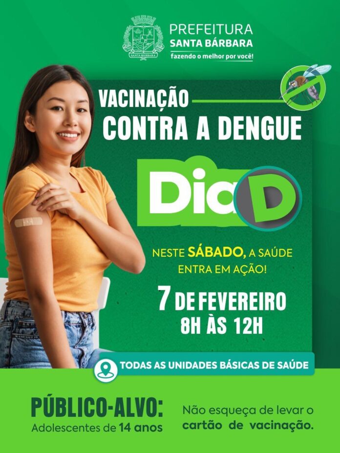 A Prefeitura de Santa Bárbara realizou, no último sábado (7), o Dia D de vacinação contra a dengue, com foco em adolescentes de 14 anos, em todas as Unidades Básicas de Saúde (UBS). Ao longo da semana anterior, a imunização contemplou crianças e adolescentes de 10 a 13 anos, conforme a disponibilidade de doses enviadas pela Gerência Regional de Saúde (GRS) de Itabira.